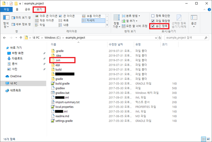 형상관리도구 SVN 에 연결되었던 프로젝트 안에는 .svn 폴더가 위치한다.