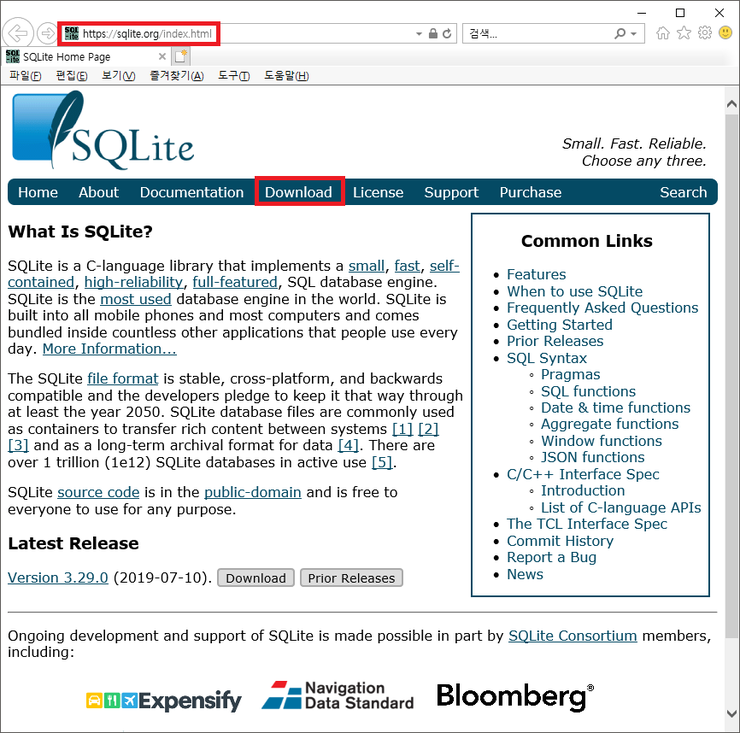 SQLite 사이트 https://sqlite.org/ 에 접속하여 Download 메뉴를 클릭한다.
