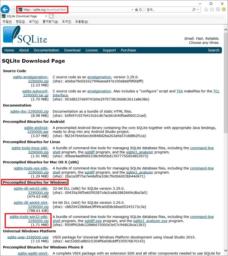 Download 페이지에서 [Precompiled Binaries for Windows] 항목을 찾고, sqlite-tools-win32-x86-32900000.zip 파일을 다운받는다.