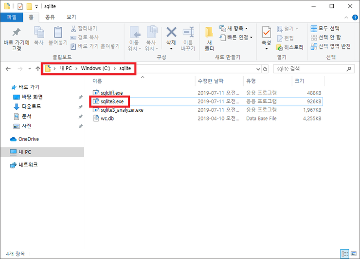 필자는 폴더명을 sqlite로 지정했으며, sqlite3.exe 파일이 C:\sqlite\sqlite3.exe 에 위치하도록 이동시켰다.