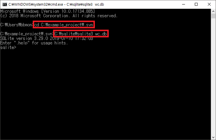 SQLite 로 wc.db 를 열어본다. (명령어 C:\sqlite\sqlite3 wc.db)