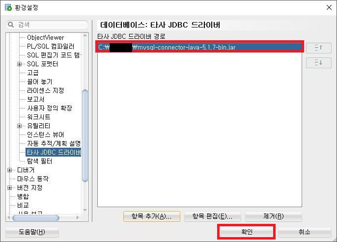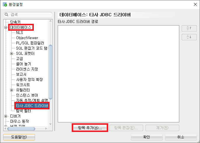 1-3. [환경설정] 좌측 메뉴의 [데이터베이스] – [타사 JDBC 드라이버] 클릭 – 하단의 [항목 추가] 버튼 클릭
