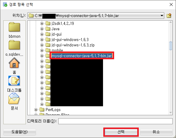 1-4. 특정위치의 mysql-connector-java-5.1.7-bin.jar 클릭 후 [선택] 버튼 클릭