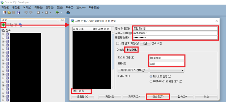 (4) [테스트] 버튼을 눌러 [상태: 성공]이 나오면 잘 연결된 것이다.