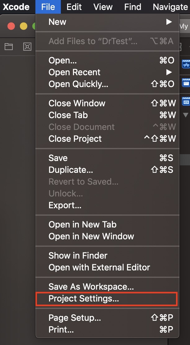 1. XCode 상단메뉴의 [File] – [Project Settings…] 클릭
