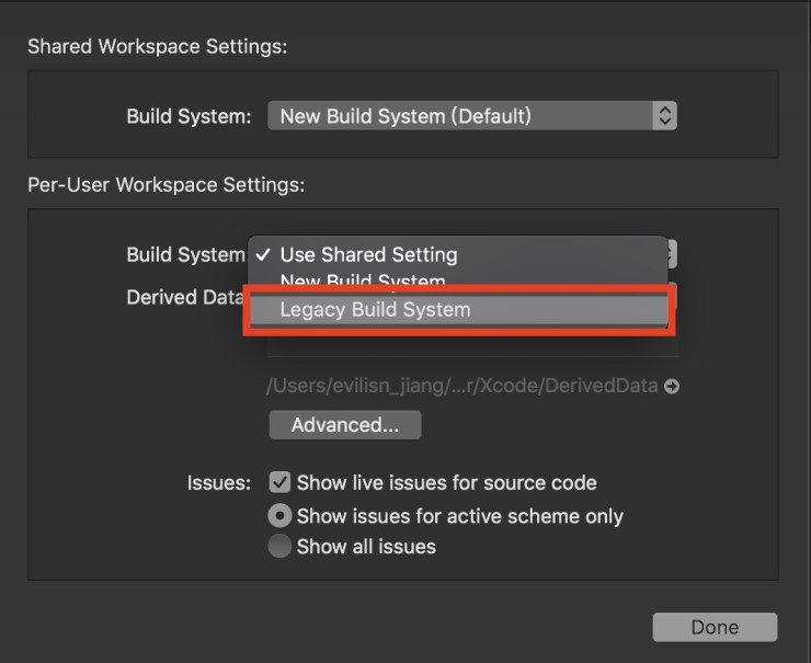 2. Build System 의 항목을 Legacy Build System 으로 선택