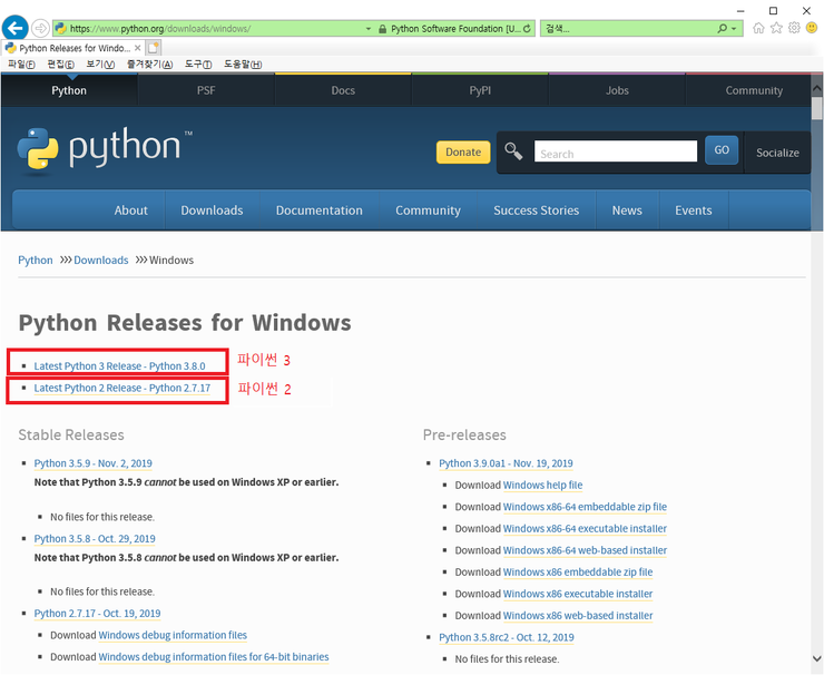 파이썬 3을 설치할지 파이썬 2를 설치할지에 따라, [Latest Python 3 Release – Python 3.8.0] 또는 [Latest Python 2 Release – Python 2.7.17] 를 클릭한다.