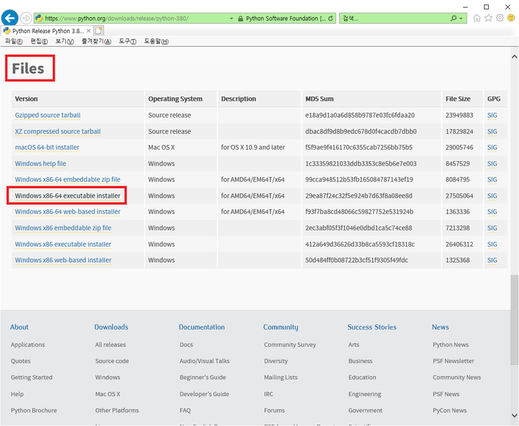 [Latest Python 3 Release – Python 3.8.0] 을 클릭한 경우, 스크롤을 내리면 하단에 Files 항목이 있다.