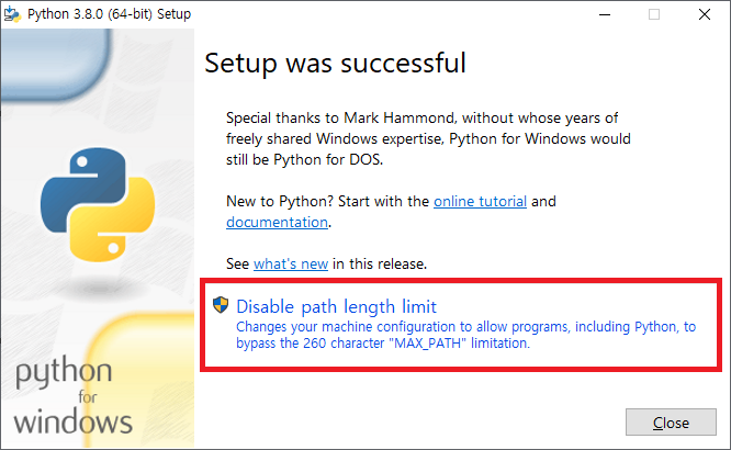 6. [Disable path length limit] 를 클릭한다. 만약 아래 화면이 나오지 않는다면 무시해도 좋다.