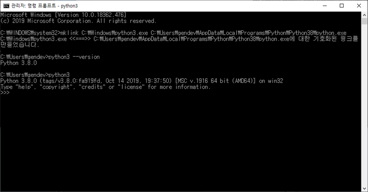 예를 들어, mklink C:\Windows\python3.exe C:\Users\gendev\AppData\Local\Programs\Python\Python38\python.exe 라고 입력한다.