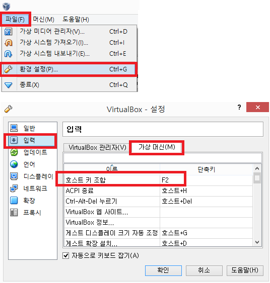 [파일]-[환경설정]에 들어가서, [입력]-[가상머신]-[호스트 키 조합]으로 가서 F2키로 변경한다. 이러면 호스트키가 F2 키가 된다.