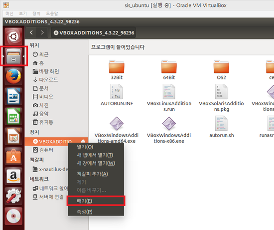 이 경우 내 폴더-VBOXADDION 에서 마우스 오른쪽 키해서 “빼기(Eject)”해준다.