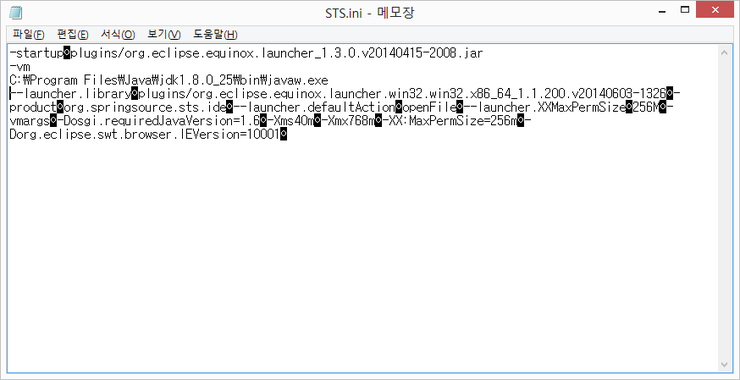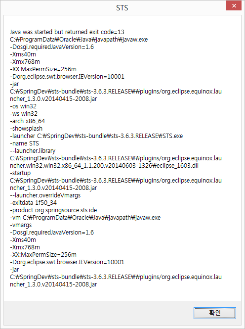 이클립스나 STS에서 exit code 13 에러가 발생했다면 exe파일이 있는 곳의 int 파일을 메모장으로 고쳐야 한다. 예를 들어 C:\SpringDev\sts-bundle\sts-3.6.3.RELEASE 에 STS.exe가 있다면 같이 있는 STS.ini 파일을 편집한다.