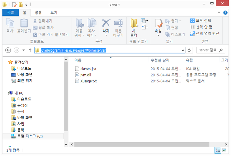 파일이 존재하는 위치가 컴퓨터마다 다른데, 내 컴퓨터의 경우 C:\Program Files\Java\jre7\bin\Server 였다.