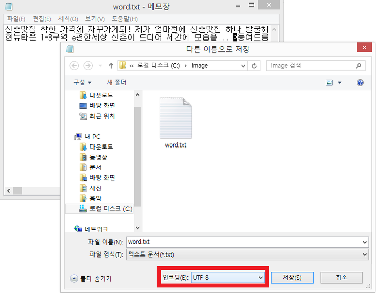 반드시 UTF-8 로 저장된 txt만 가능하다.