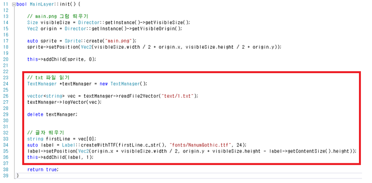 일단 지난번 만들었던 MainScene.cpp 의 init 함수 하단에 txt 파일을 읽고, 글자를 띄우는 코드를 적었습니다.