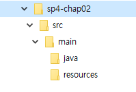 C:\spring4\sp4-chap02 폴더를 생성한다. 이어서 아래와 같은 구조가 되도록 폴더 생성한다.