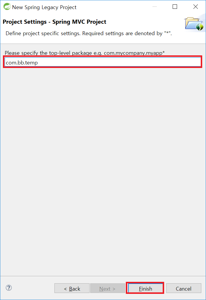 [New Spring Legacy Project] 윈도우가 뜰 것이다. 프로젝트 이름은 TempProject 로 하고, Templates 항목은 Spring MVC Project 를 선택, [Next] 버튼을 클릭한다.
