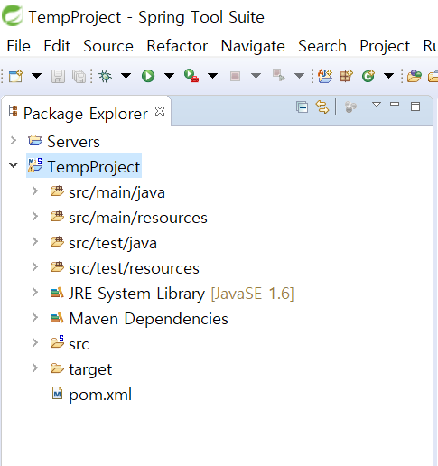 STS 좌측 패키지 탐색기 영역의 프로젝트 폴더(여기서는 TempProject 폴더) 위에서 마우스우클릭 후,