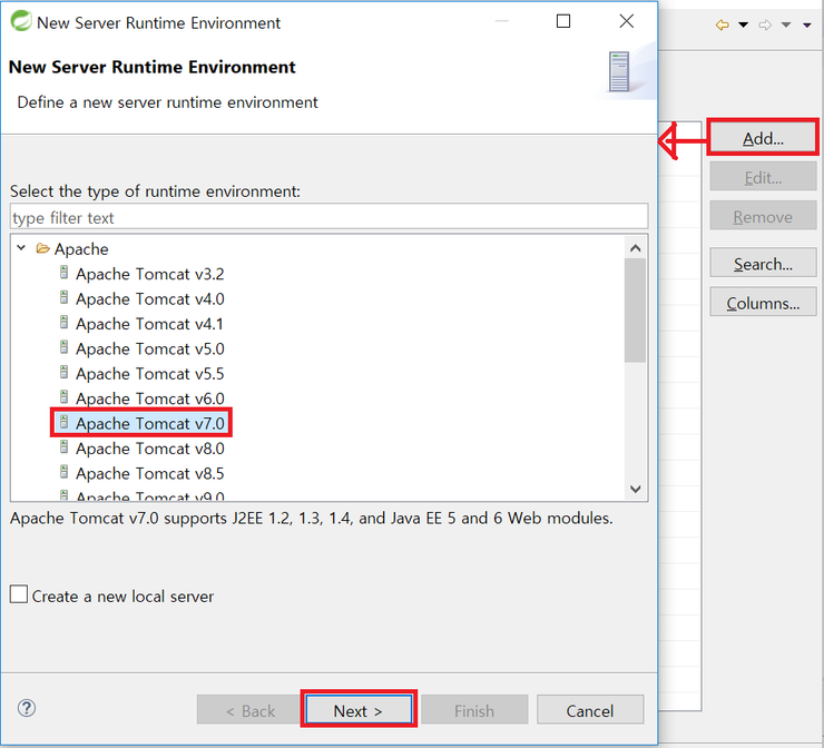 [Add] 버튼을 누르고 [Apache Tomcat v7.0] 을 선택하고 [Next] 버튼을 누른다.