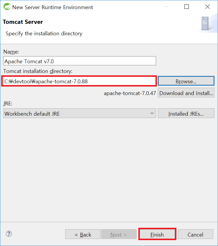 tomcat7 디렉토리의 위치를 입력하고 [Finish] 버튼을 클릭한다.