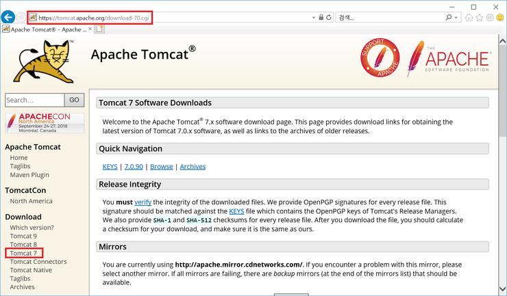 좌측 메뉴 Download의 [Tomcat 7]을 클릭하면 다운로드 페이지가 나온다.