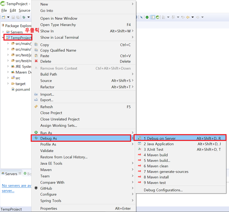 [Debug As] – [Debug on Server] 를 클릭한다.