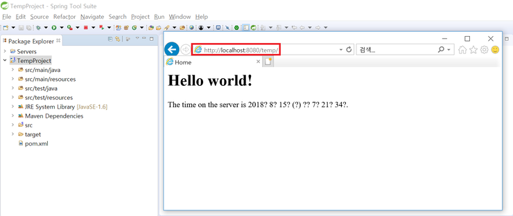 localhost:8080/temp 로 접속하면 Hello world! 가 표시된다.