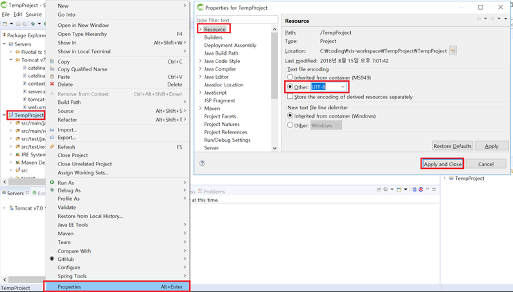 Properties 윈도우가 뜨면 좌측 메뉴의 [Resource] 를 선택하고, Text file encoding 항목을 Other : UTF-8 로 입력하고, [Apply and Close] 클릭한다.