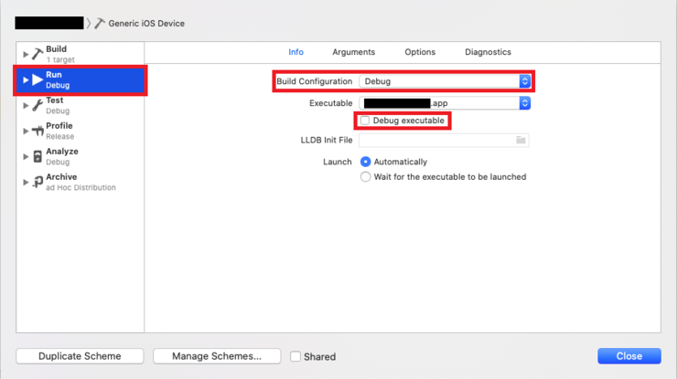 Edit Scheme 메뉴에서 Build Configuration 값을 Debug 로 변경하고, [Debug executable] 체크박스를 체크하면 앱이 디버그 모드로 실행되어 브레이크 포인트에 걸린다.